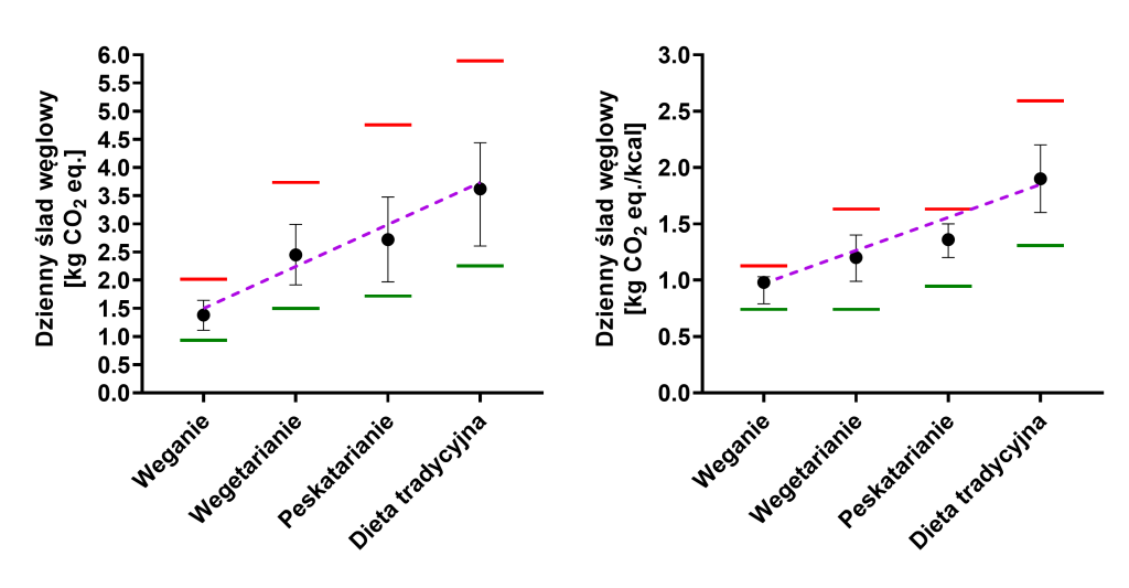 Dzienny ślad węglowy w zależności od stosowanej diety – całkowity (po lewej) i przeliczony na wartość energetyczną (po prawej)